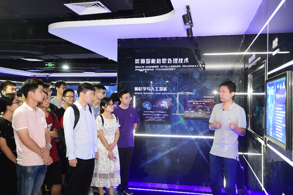 中國科學(xué)技術(shù)大學(xué)的學(xué)生在類腦智能技術(shù)及應(yīng)用國家工程實(shí)驗(yàn)室展廳內(nèi)參觀。記者 黃博涵 攝