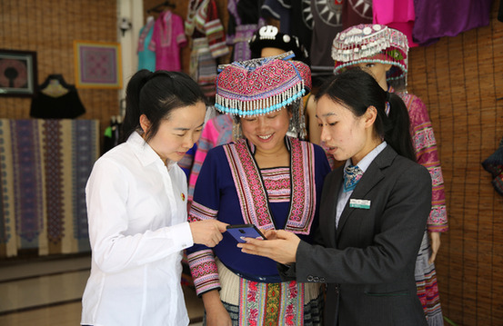 農(nóng)行云南屏邊縣支行有效支持“苗繡”發(fā)展,農(nóng)行職工為合作社負(fù)責(zé)人安裝掌上銀行。梁志強 攝