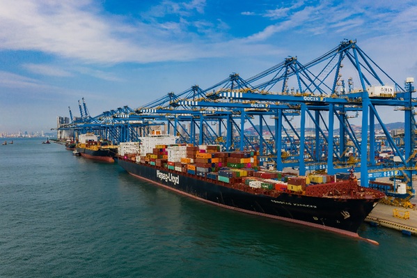 碧海藍(lán)天之間,山東港口青島港全自動(dòng)化碼頭上杳無人蹤,生產(chǎn)作業(yè)卻如行云流水。16臺(tái)藍(lán)色自動(dòng)化橋吊矗立海邊,從來自全球各地的巨輪上卸載著集裝箱;高速軌道吊在堆場上往來穿梭;自動(dòng)導(dǎo)引車流轉(zhuǎn)自如,重達(dá)數(shù)十噸的集裝箱被輕巧抓起、精準(zhǔn)堆碼。
