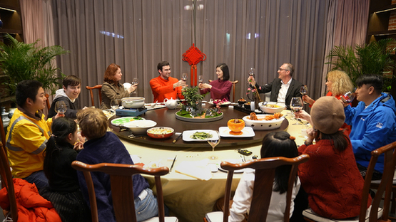 在武漢生活多年的外國(guó)人克萊因、海龍、高佑思,春節(jié)期間在武漢與雷神山、火神山醫(yī)院建設(shè)者,外賣小哥等共同慶祝新年。記者 熊琦 攝