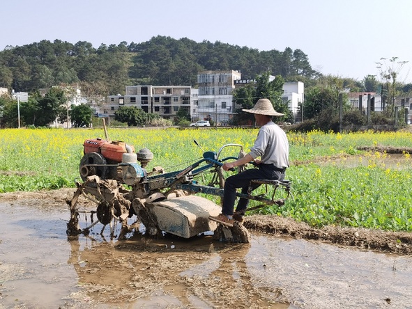 桂平市是廣西重要的糧食種植基地之一,去年糧食種植面積達157.21萬畝,糧食總產(chǎn)量55.37萬噸。一大早,桂平市石咀鎮(zhèn)治安村48歲的村民冼才貞趕到農(nóng)田,駕駛耕地機忙著犁地,一上午要把3畝剛灌溉的農(nóng)田翻犁一遍,為接下來的水稻育秧做好準備?!拔遗莘N300多斤,現(xiàn)在已經(jīng)開始育秧了?!辟咆懻f,目前他種有150多畝水稻,今年準備擴種20畝稻田。