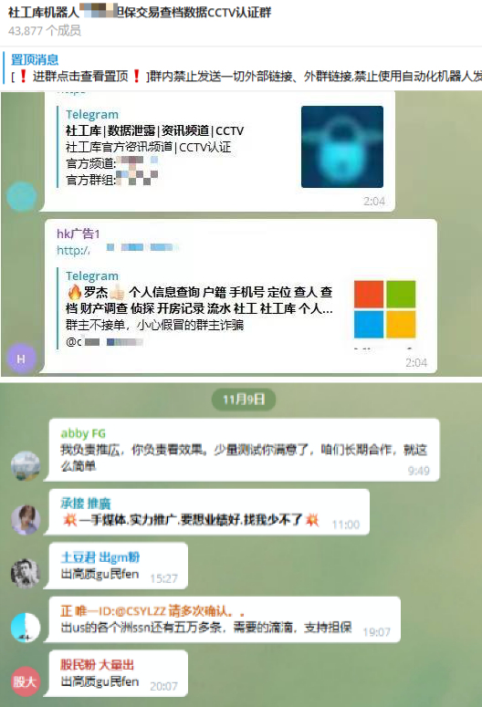 近期,記者在Telegram上一個名為“社工機器人&閑魚擔(dān)保交易查檔數(shù)據(jù)某認證群”的社交群上看到,大量的包括戶籍、手機號、定位、查人查檔、財產(chǎn)調(diào)查、開房記錄、流水等在內(nèi)的用戶信息被公開售賣,十分猖獗。
