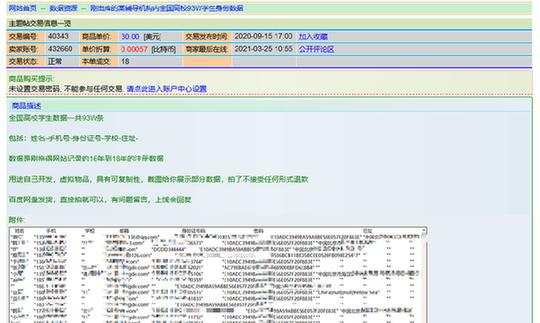 記者在暗網(wǎng)上看到,一份標(biāo)稱剛出庫的某輔導(dǎo)機構(gòu)全國高校93萬學(xué)生身份數(shù)據(jù)售賣,打包價格為30美元。發(fā)帖者稱,數(shù)據(jù)是網(wǎng)站記錄的2016年到2018年的注冊數(shù)據(jù),里面包括姓名、手機號、學(xué)校、住址等信息。目前該數(shù)據(jù)包顯示已有18次成交。
