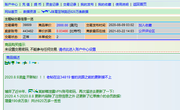 與個人隱私信息售價低廉不同的是,含賭博類會員的信息價格直線上漲。有帖主表示,某體育足球類App郵箱泄露VPN賬號密碼,除了新增2020年4月1日到2020年8月8日的注冊信息外,還更新了紅單推介會員數(shù)據(jù),增量190萬條。值得注意的是,該數(shù)據(jù)包售價高達2000美元,已有2單成交。