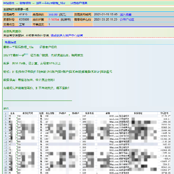另一個在售的數(shù)據(jù)包為某證券公司多達16萬的客戶信息,標(biāo)價368美元。發(fā)帖者表示,該數(shù)據(jù)為2021年最新一手客戶數(shù)據(jù),內(nèi)部渠道流出,暗網(wǎng)首發(fā)。“數(shù)據(jù)一共16.5萬條,已去重,實號率95%以上,數(shù)據(jù)保真?!?/p>