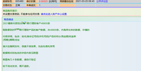 交易編號為41847的帖子顯示,其擁有前述商業(yè)銀行理財客戶數(shù)據(jù)48800條。“該數(shù)據(jù)為內(nèi)鬼帶出,首次在暗網(wǎng)發(fā)布,每份售價168美元?!卑l(fā)帖者稱。