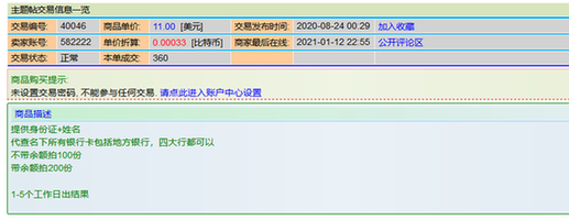 除了黑客等技術(shù)人員盜取批量信息之外,也有一些“內(nèi)鬼”直接參與其中。交易編號為40046的帖子顯示:“只要提供身份證和姓名信息,便可代查名下所有銀行卡具體信息,不帶余額1100美元,結(jié)果帶余額需2200美元,1-5個工作日即可出結(jié)果?!敝档米⒁獾氖?,該貼自2020年8月24日發(fā)布以來,目前已交易多達360單。