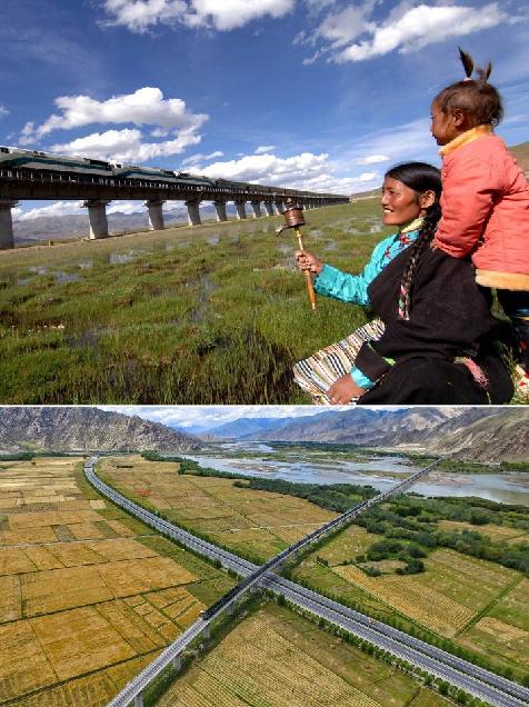 上圖為西藏當(dāng)雄縣藏族群眾在觀看火車駛過(2006年6月17日記者覺果攝);下圖為在西藏拉薩市曲水縣拍攝的公路與鐵路(2016年8月17日記者普布扎西攝 無人機照片),西藏已形成了公路、鐵路、航空的立體交通網(wǎng)絡(luò)。新華社發(fā)