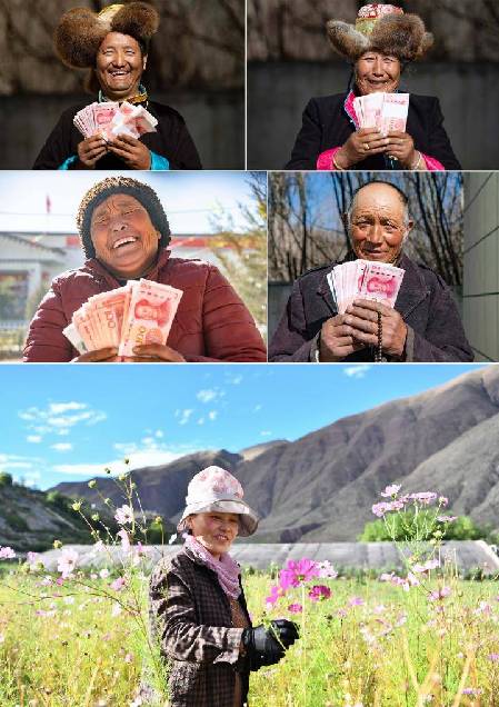 上四圖為2021年2月9日,山南市乃東區(qū)克松社區(qū)領(lǐng)到分紅的農(nóng)民興高采烈(記者普布扎西攝);下圖為西藏昌都市察雅縣卡貢村村民在當(dāng)?shù)孛缙援a(chǎn)業(yè)基地采集鮮花種子,曾經(jīng)的建檔立卡貧困戶在這里實現(xiàn)了就業(yè),完成了脫貧(2020年9月28日 記者晉美多吉攝)。新華社發(fā)