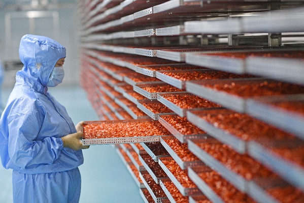 ????▲工人在寧夏百瑞源枸杞股份有限公司鎖鮮枸杞生產線上檢查產品質量。記者 王鵬 攝