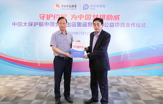 7月12日,中國(guó)太保向國(guó)家體育總局排球運(yùn)動(dòng)管理中心遞送中國(guó)女排專屬定制保單。(中國(guó)太保供圖)