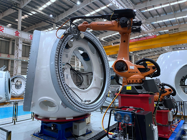 浙江省機電集團所屬運達風(fēng)電裝配車間里,機器人正在進行緊固變槳軸承螺栓作業(yè)。資料照片