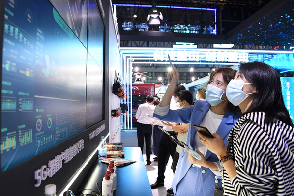 ????在2021智博會現(xiàn)場,工作人員(前左)向觀眾介紹“5G+智能制造”的應用。(資料照片)新華社記者 唐奕 攝