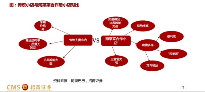 ????招商證券指出,在前端,淘菜菜推動(dòng)夫妻小店現(xiàn)代化,使其成為功能多元的社區(qū)綜合服務(wù)店。淘菜菜提供三方面升級(jí):“云菜場”,支持小店的生鮮生意;?“一店多能”,支持云菜場、便利店、收發(fā)快遞、外賣配送等多種模塊;“品牌店”,扶持一批夫妻小店品牌升級(jí)。據(jù)阿里披露,最近半年接入淘菜菜的小店綜合收入提升了30%。