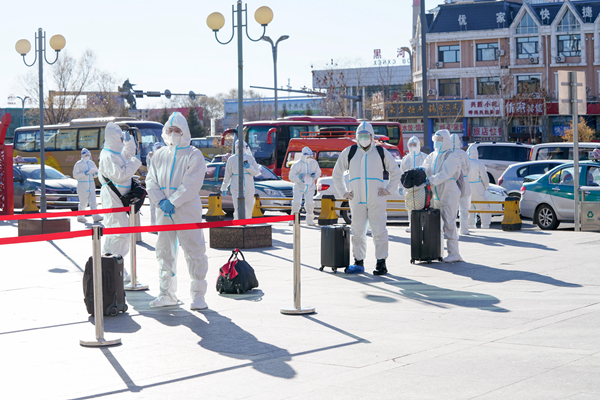 11月1日中午,在黑河國(guó)際公路客運(yùn)站,身穿防護(hù)服的轉(zhuǎn)運(yùn)者正在車站外排隊(duì)入站,車站內(nèi)的轉(zhuǎn)運(yùn)大巴排成一列。在現(xiàn)場(chǎng),來自黑河市愛輝區(qū)各個(gè)街道的工作人員進(jìn)行著信息登記核實(shí)和組織引導(dǎo)等工作。