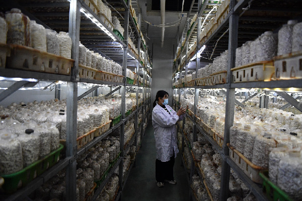 河南世紀(jì)香食用菌開發(fā)有限公司員工正在查看白靈菇菌種生長(zhǎng)情況。新華社記者 李嘉南 攝