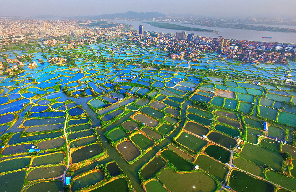 南海九江鎮(zhèn)水網(wǎng)交錯,高空俯瞰下魚塘成片,或是村落林立,或是公路貫穿,構(gòu)成一幅幅富有特色的水鄉(xiāng)人家、?;~塘的田園畫面。(南海區(qū)委宣傳部供圖)