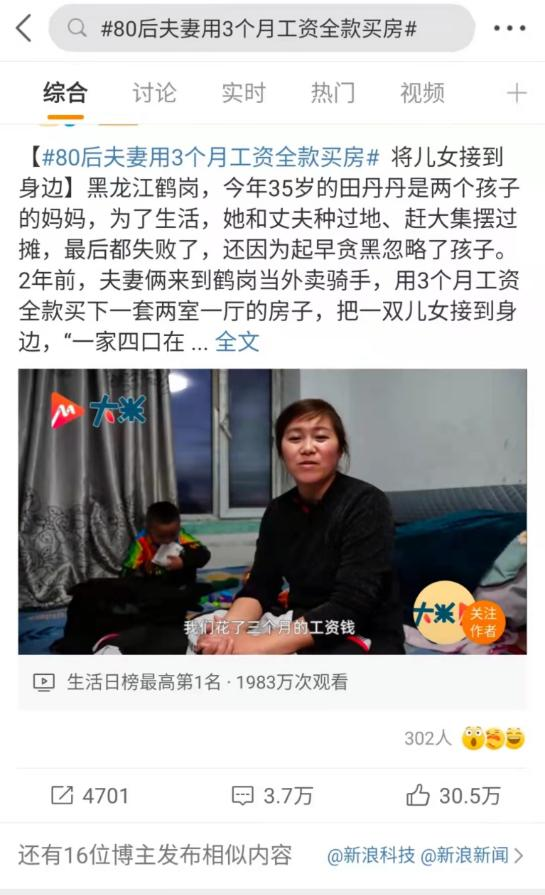 #80后夫妻用3個(gè)月工資全款買房#、#鶴崗的房價(jià)為什么這么低#、#95后鶴崗小伙經(jīng)營小串年入百萬#等微博話題接連被網(wǎng)民送上熱搜,目前閱讀量已超7億。