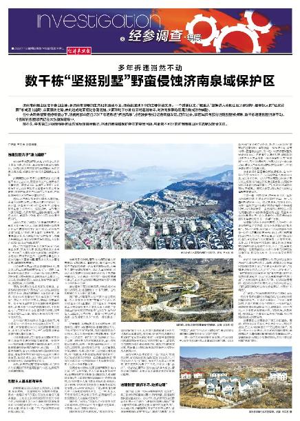 1月13日上午,《經(jīng)濟(jì)參考報》刊發(fā)《多年拆違巋然不動,數(shù)千棟“堅挺別墅”野蠻侵蝕濟(jì)南泉域保護(hù)區(qū)》一文。