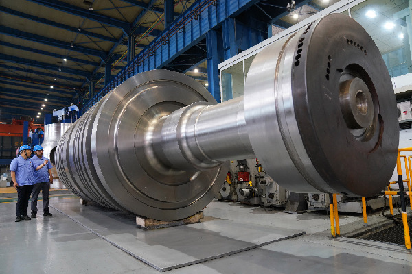 2021年7月1日,中國一重集團有限公司軋電制造廠生產(chǎn)車間,工人在對企業(yè)自主制造的百萬千瓦整鍛低壓轉子進行檢測作業(yè)。新華社記者 王建威 攝