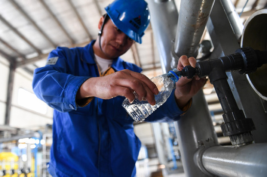 國家能源集團(tuán)旗下公司廢水處理中心,一名工作人員展示經(jīng)過處理后的污水。記者 劉磊 攝