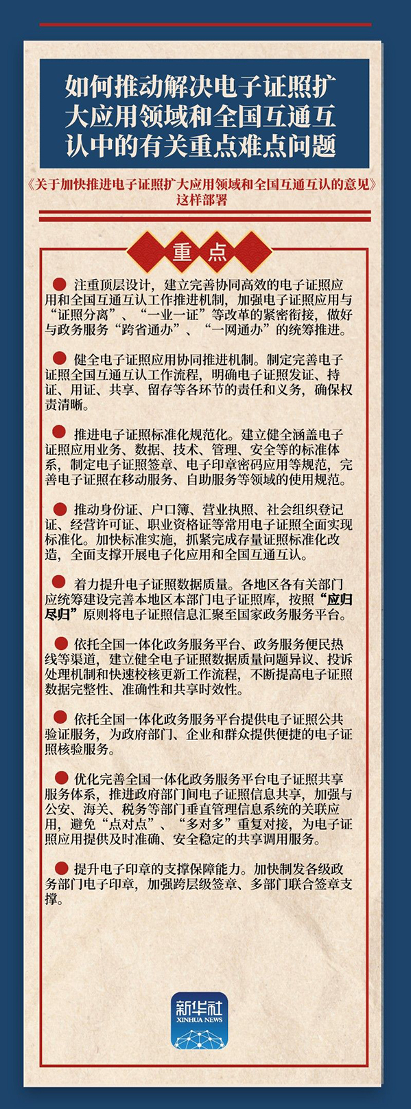 為解決電子證照應(yīng)用的痛點和難點,《意見》明確指出,健全電子證照應(yīng)用協(xié)同推進(jìn)機制,加強電子證照應(yīng)用跨地區(qū)、跨部門工作協(xié)同。各地區(qū)各有關(guān)部門應(yīng)統(tǒng)籌建設(shè)完善本地區(qū)本部門電子證照庫,按照“應(yīng)歸盡歸”原則將電子證照信息匯聚至國家政務(wù)服務(wù)平臺。