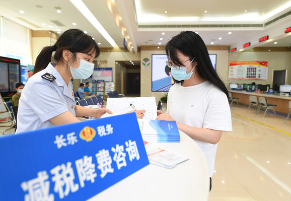 2020年8月19日,在國家稅務總局福州市長樂區(qū)稅務局辦稅大廳,工作人員在輔導企業(yè)人員辦理減稅降費業(yè)務。新華社記者 宋為偉 攝