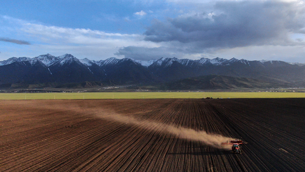 青海省三江集團(tuán)門源種馬場的工人駕駛農(nóng)機(jī)在油菜田里播種(無人機(jī)照片)。記者 張宏祥 攝