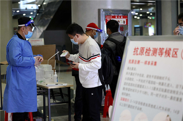 3月27日,在合肥火車站出站大廳,出站旅客領(lǐng)取免費(fèi)發(fā)放的抗原檢測(cè)試劑。新華社發(fā)(解琛 攝)