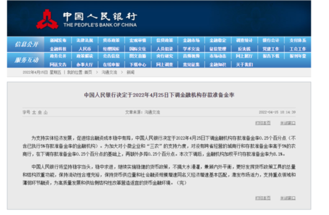 為支持實(shí)體經(jīng)濟(jì)發(fā)展,促進(jìn)綜合融資成本穩(wěn)中有降,中國(guó)人民銀行決定于2022年4月25日下調(diào)金融機(jī)構(gòu)存款準(zhǔn)備金率0.25個(gè)百分點(diǎn)(不含已執(zhí)行5%存款準(zhǔn)備金率的金融機(jī)構(gòu))。為加大對(duì)小微企業(yè)和“三農(nóng)”的支持力度,對(duì)沒有跨省經(jīng)營(yíng)的城商行和存款準(zhǔn)備金率高于5%的農(nóng)商行,在下調(diào)存款準(zhǔn)備金率0.25個(gè)百分點(diǎn)的基礎(chǔ)上,再額外多降0.25個(gè)百分點(diǎn)。本次下調(diào)后,金融機(jī)構(gòu)加權(quán)平均存款準(zhǔn)備金率為8.1%。