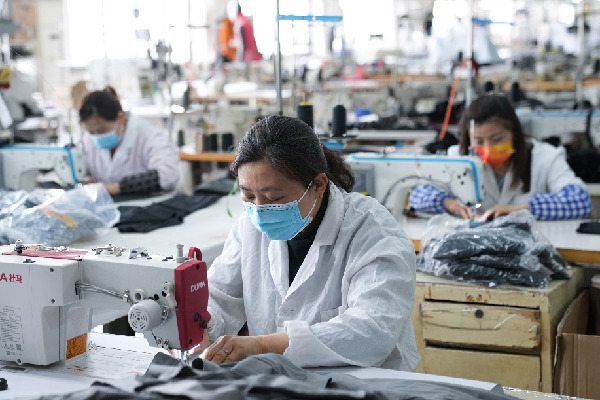 4月16日,在位于合肥廬陽(yáng)經(jīng)開(kāi)區(qū)的合肥清華勝嘉服飾有限公司生產(chǎn)車(chē)間,工人們?cè)谏a(chǎn)戶(hù)外服飾。
