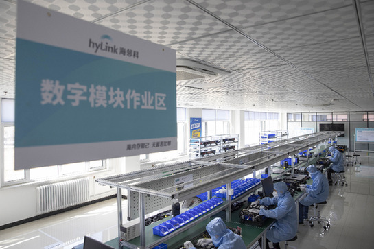 4月24日,在哈爾濱海鄰科信息技術有限公司生產(chǎn)車間,工作人員在進行生產(chǎn)作業(yè)。