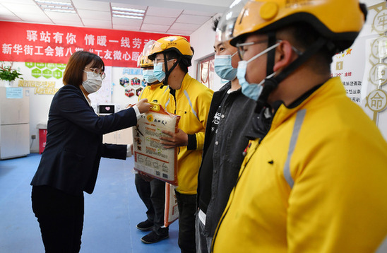 “五一”國際勞動節(jié)來臨之際,寧夏銀川市興慶區(qū)新華街工會開展“驛站有你 情暖一線勞動者”慰問活動。工作人員根據(jù)征集來的“工友微心愿”準備慰問品,為勞動者送上電飯煲、保溫壺、夏涼被、米、面、油等節(jié)日禮物。