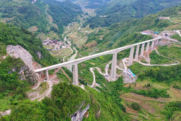這是建設(shè)中的貴南高鐵桐子園雙線特大橋(無(wú)人機(jī)照片)。5月16日,在位于貴州省貴定縣境內(nèi)的貴南高鐵建設(shè)施工現(xiàn)場(chǎng),中鐵廣州局建設(shè)者們正加緊施工,為貴南高鐵早日建成通車(chē)而努力。貴南高鐵是我國(guó)“八縱八橫”高速鐵路主通道包頭至??谕ǖ赖闹匾M成部分,設(shè)計(jì)時(shí)速350公里。