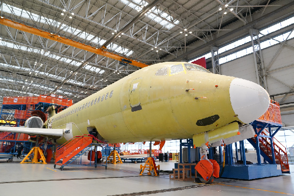 ▲中國商飛上海飛機制造有限公司總裝車間內的國產ARJ21飛機。記者 丁汀 攝