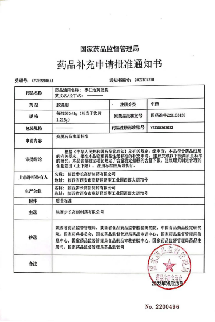 公司于2021年確定棗仁地黃膠囊黃芩苷質(zhì)量標(biāo)準(zhǔn)修訂研究,擬定質(zhì)量標(biāo)準(zhǔn)通過(guò)了陜西省食品藥品監(jiān)督檢驗(yàn)研究院技術(shù)復(fù)核,于2022年04月向國(guó)家局提交變更注冊(cè)標(biāo)準(zhǔn)的申請(qǐng),近日已取得國(guó)家藥品監(jiān)督管理局藥品補(bǔ)充申請(qǐng)批準(zhǔn)通知書(shū)。