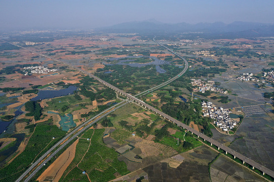 南廣高鐵和蒼碩高速在廣西賓陽縣古辣鎮(zhèn)交匯(2022年4月4日攝,無人機(jī)照片)。新華社記者 黃孝邦 攝