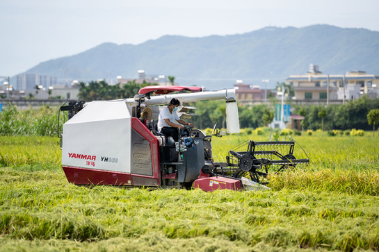 7月4日,在三亞市崖州區(qū)(壩頭)南繁公共試驗基地,農(nóng)機手在收割水稻。