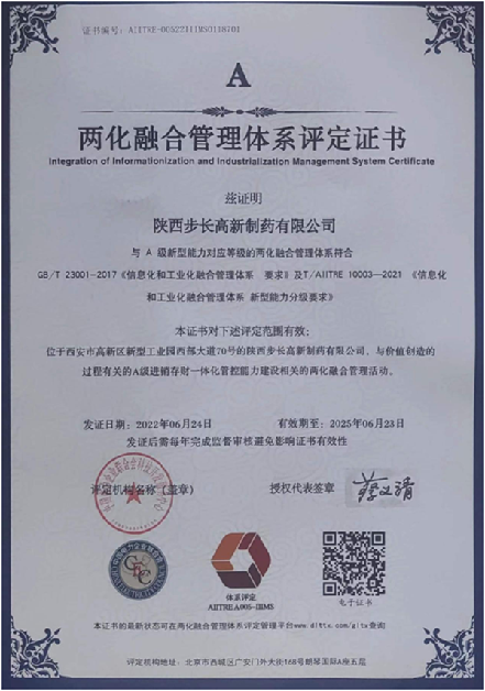 步長高新為積極響應(yīng)國家全面推廣信息化和工業(yè)化融合管理體系標(biāo)準(zhǔn)的政策,提升管理效率帶動企業(yè)技術(shù),產(chǎn)品與管理創(chuàng)新,提高企業(yè)核心競爭優(yōu)勢,通過對公司過程管理來持續(xù)打造企業(yè)信息化環(huán)境下新型能力,同時更好將信息化融入企業(yè)管理中,于2021年05月順利召開了兩化融合管理體系貫標(biāo)啟動會,成立了兩化融合推行領(lǐng)導(dǎo)小組和工作小組。通過深入學(xué)習(xí)領(lǐng)會,按照GB/T23001-2017《信息化和工業(yè)化融合管理體系要求》及T/AIITRE10003-2021《信息化和工業(yè)化融合管理體系新型能力分級要求》最終完成兩化融合管理體系的文件編制與修訂、運行、內(nèi)部審核、管理評審等工作。經(jīng)逐級申報由西安市工業(yè)和信息化局最終審核通過,于2021年09月成功入選為西安市級兩化融合管理體系貫標(biāo)試點企業(yè)。2022年04月通過了專家審核組的現(xiàn)場審核,經(jīng)國家兩化融合評定委員會評定,順利通過以打造“與價值創(chuàng)造的過程有關(guān)的A級進銷存財一體化管控能力建設(shè)”為兩化融合管理活動目標(biāo)的認證工作。