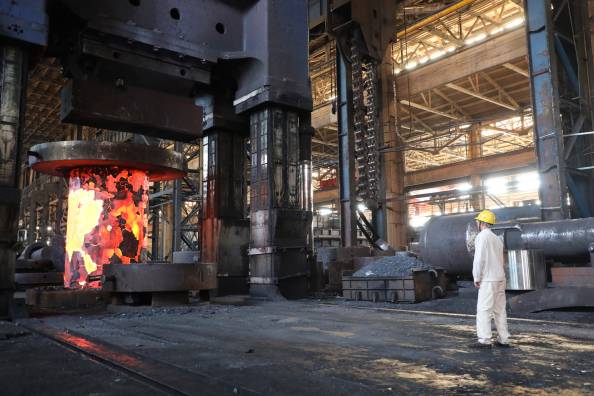 水壓機(jī)鍛造廠車間內(nèi),一個(gè)10米多長(zhǎng)、5米多寬的巨型鐵剪,正夾著一個(gè)燒得火紅透亮的合金鋼錠來到水壓機(jī)前,在咣咣的鍛壓聲中火星四射,很快就縮小了一大圈。