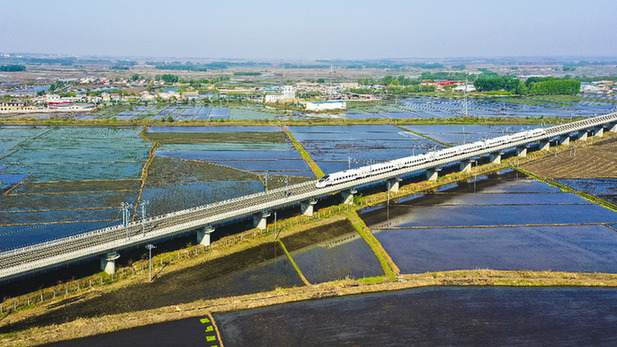 在哈牡高鐵線上,一列動(dòng)車(chē)組列車(chē)正從稻田間駛過(guò)。資料照片