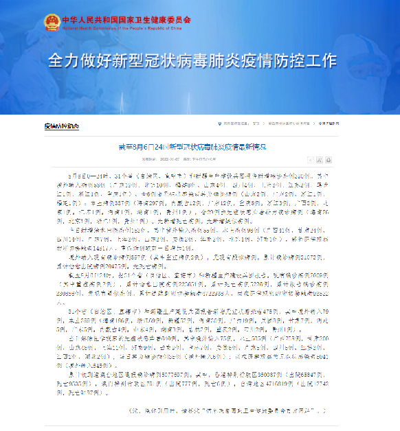 截至8月6日24時(shí),據(jù)31個(gè)?。ㄗ灾螀^(qū)、直轄市)和新疆生產(chǎn)建設(shè)兵團(tuán)報(bào)告,現(xiàn)有確診病例2009例(其中重癥病例2例),累計(jì)治愈出院病例223651例,累計(jì)死亡病例5226例,累計(jì)報(bào)告確診病例230886例,無(wú)現(xiàn)有疑似病例。累計(jì)追蹤到密切接觸者4722938人,尚在醫(yī)學(xué)觀察的密切接觸者93522人。