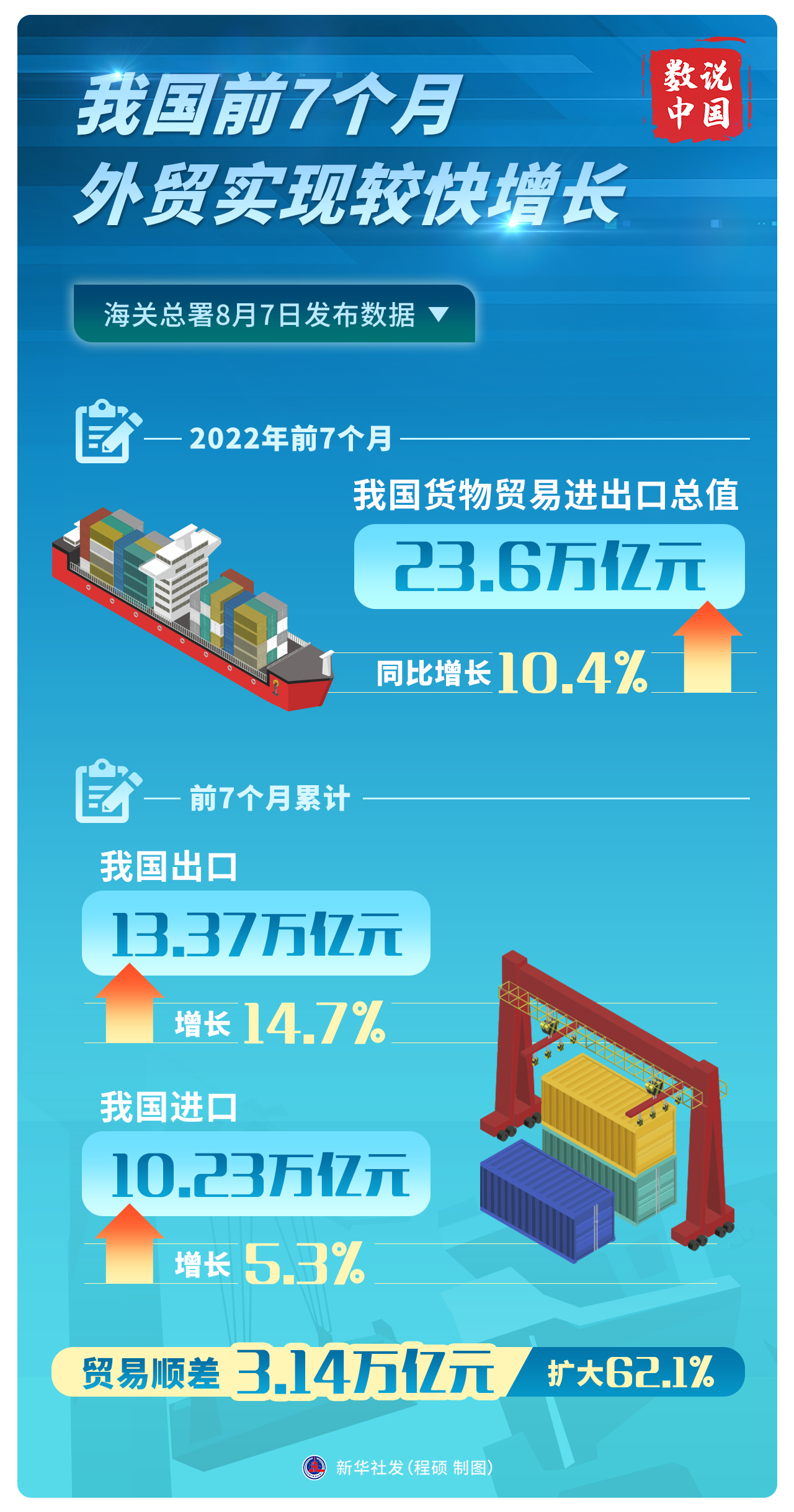 8月7日,海關(guān)總署發(fā)布數(shù)據(jù)顯示,今年前7個月,我國進出口總值23.6萬億元人民幣,比去年同期增長10.4%。其中,7月份進出口總值3.81萬億元,同比增速進一步提升為16.6%。