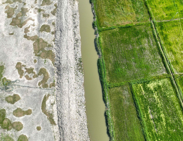 鎮(zhèn)賚縣稻田(右)與鹽堿灘涂一處交界(2022年7月12日攝,無人機照片)。潘晟昱 攝