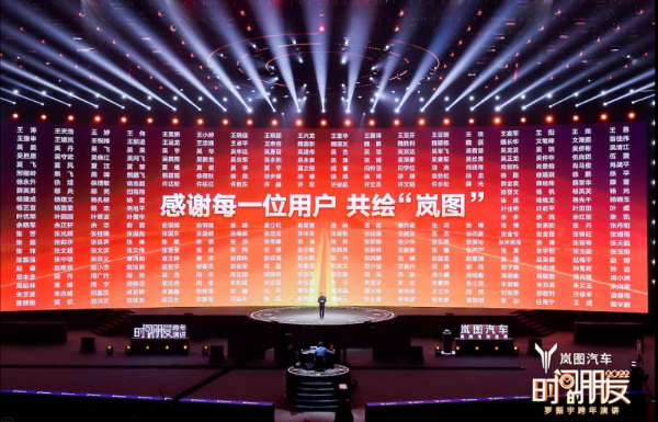 ??很多人也許還對2021年12月31日得到APP創(chuàng)始人羅振宇主講的那場《時間的朋友》跨年演講印象深刻,這場思想盛宴吸引了超6000萬名觀眾在線觀看。嵐圖汽車的標(biāo)識也出現(xiàn)在舞臺顯眼位置,在鏡頭中多次露出。作為跨年演講《時間的朋友》獨(dú)家冠名合作伙伴,嵐圖于當(dāng)晚迎來高光時刻。而在舞臺上,羅振宇說,他們找到了能代表這個時代的產(chǎn)品——嵐圖汽車。