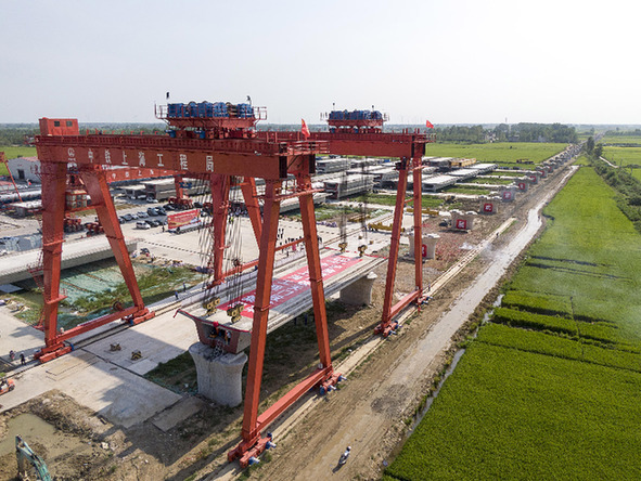 8月25日拍攝的滬渝蓉高鐵天門(mén)段首榀箱梁架設(shè)現(xiàn)場(chǎng)(無(wú)人機(jī)照片)。新華社記者 熊琦 攝