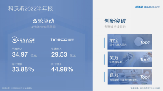 2022年8月26日晚間,科沃斯(603486.SH)發(fā)布2022年半年報(bào)。報(bào)告顯示,作為科沃斯旗下高端智能生活電器新銳品牌TINECO添可,實(shí)現(xiàn)銷售收入29.53億元人民幣,占全部收入的43.28%,較上年同期增長44.98%。