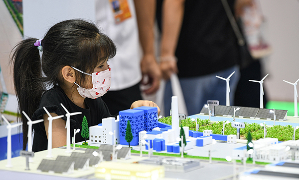 9月3日,在環(huán)境服務專題展區(qū),一名小觀眾在參觀光電碳中和模型。新華社記者 韓旭 攝