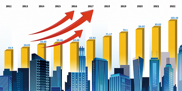 2012-2022年中國企業(yè)500強(qiáng)營業(yè)收入總額(萬億元)變化趨勢