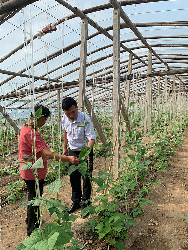 陽谷村行微小一隊客戶經(jīng)理呂緒陽在孫樓社區(qū)指導黃瓜掐花技術(資料照片)